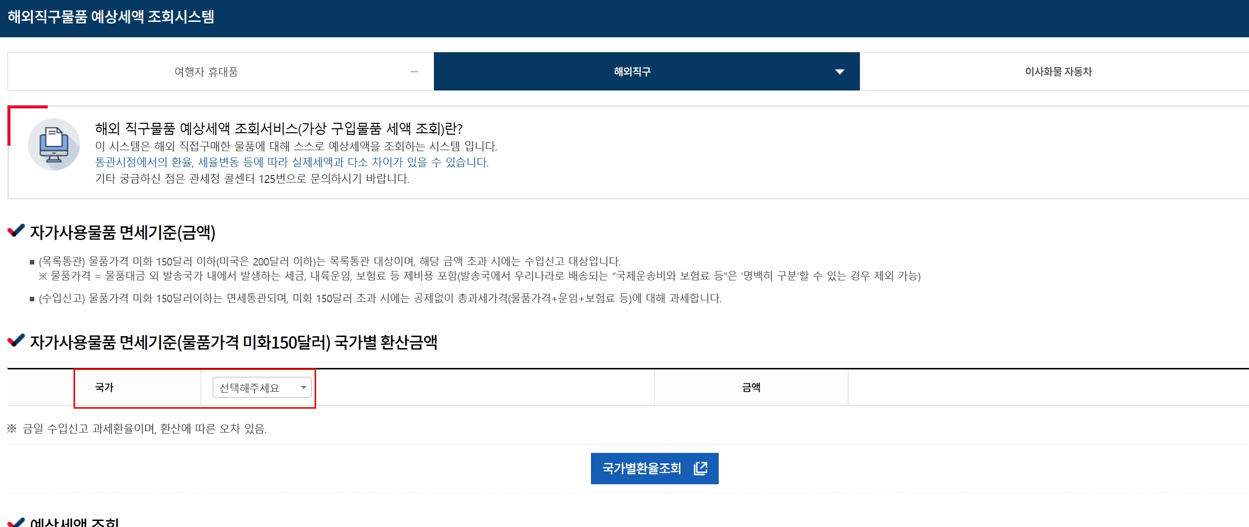 관세청에서 제공하는 해외직구물품 예상 세액 조회시스템 에서 간단한 정보 입력만으로 예상 세액을 확인할 수 있습니다.