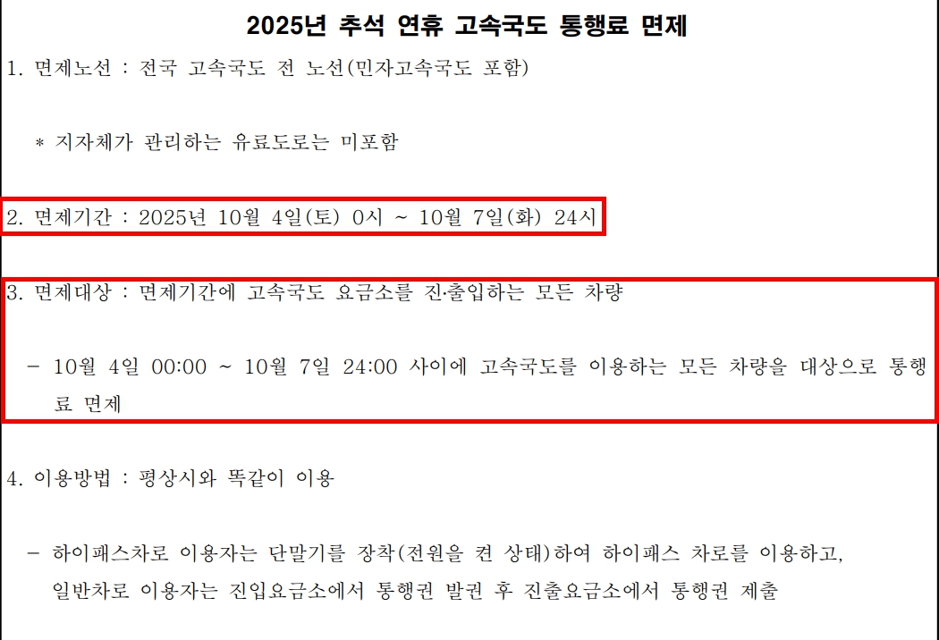 국토교통부는 2025년 10월 4일(토) 0시부터 10월 7일(화) 24시까지 총 4일간 고속도로 통행료를 면제한다고 발표했습니다.