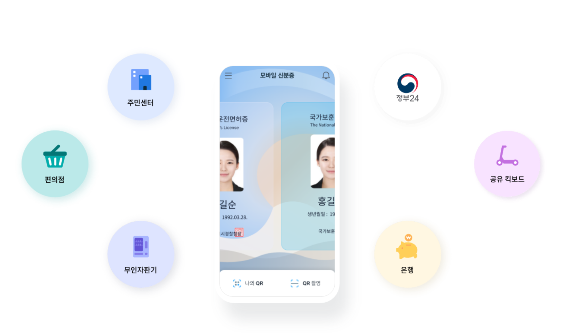 언제 어디서나 스마트폰만 있으면 신분증을 확인할 수 있으며, QR 코드나 IC 태그를 를통해 안전하게 본인 인증을 할 수 수 있습니다.
